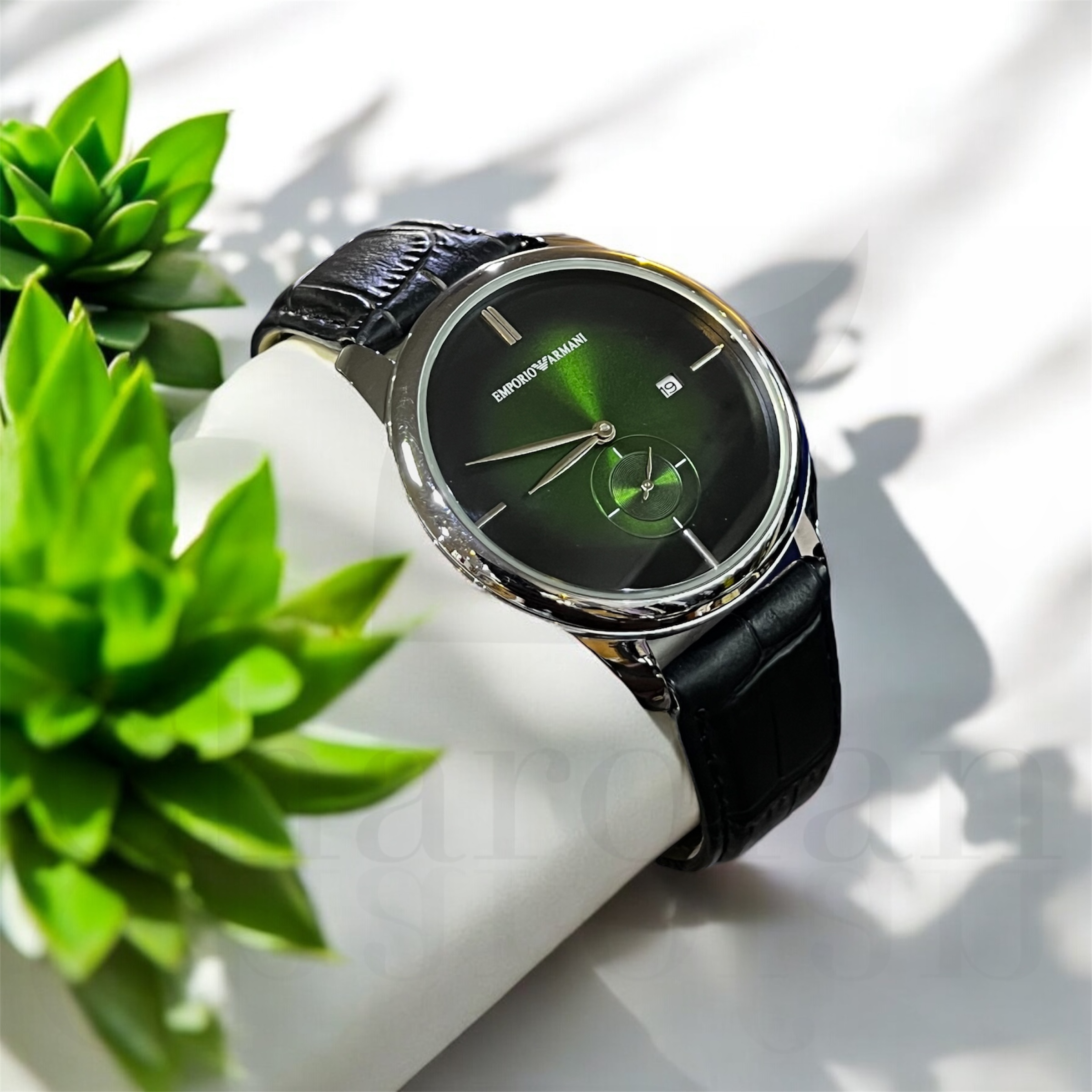Montre homme Emporio Armani avec cadran vert élégant, petite seconde, date et bracelet cuir noir pour un style chic et moderne.